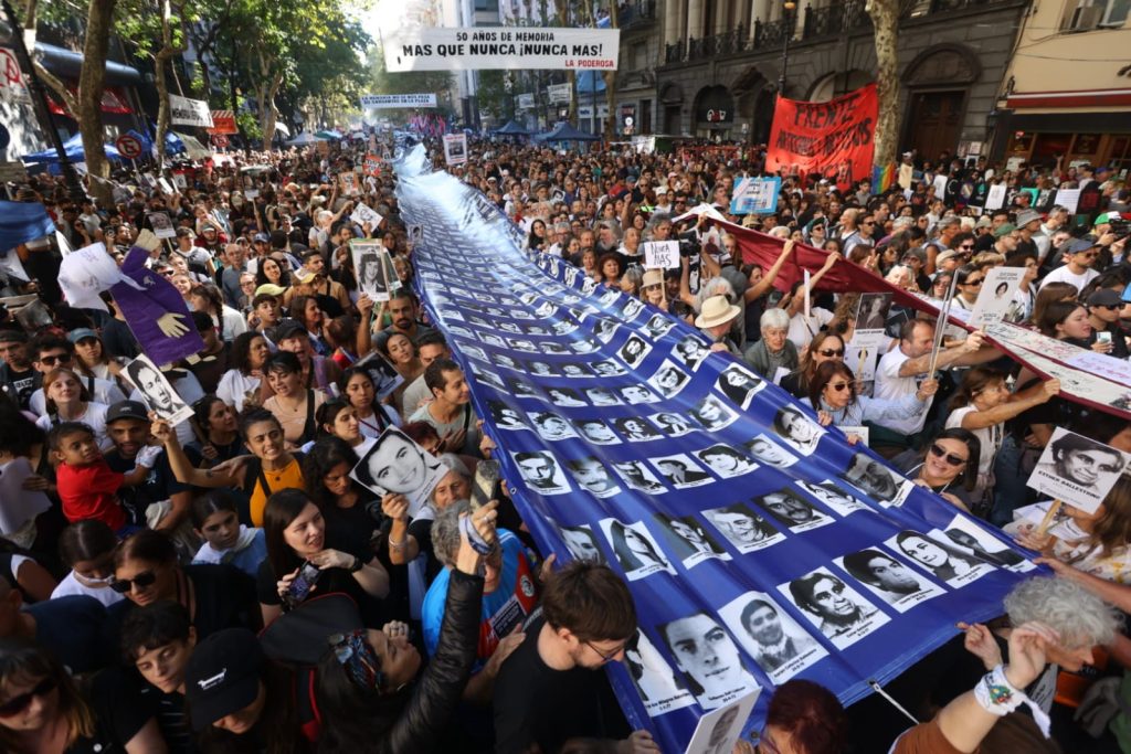 Decenas de miles de personas colmaron este lunes la Plaza de Mayo en el marco de la tradicional movilización por el Día Nacional de la Memoria por la Verdad y la Justicia, en el centro de la Ciudad de Buenos Aires. Si bien hasta el momento no han trascendido cifras estimadas, se puede arriesgar que esta marcha, en el marco del 50° aniversario del golpe de Estado de 1976, ha sido una de las más convocantes, dando muestras de la vigencia del reclamo colectivo.