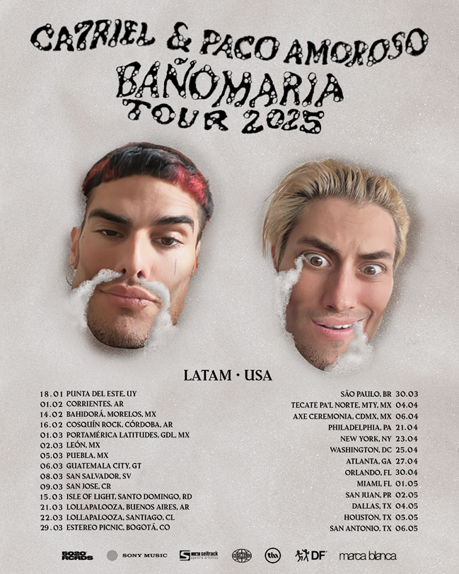 - El mundo entero está con ganas de más CA7RIEL & PACO AMOROSO y ellos no podrían estar más listos. Ahora llega la confirmación más esperada de la temporada: la gira de BAÑO MARÍA suma 24 fechas confirmadas para 2025, pasando por Argentina, México, Chile, Brasil, Colombia, Guatemala, República Dominicana, Costa Rica y El Salvador, además de paradas en 9 ciudades y 6 estados de EE.UU.