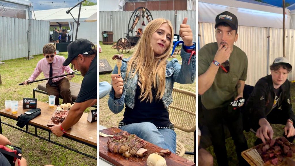 “Para que se lo imaginen, tenemos montados tres grandes fogoneros con dos asados completos —costillares— cada uno, unos vacíos colgando y más de 40 T-bone sobre la parrilla. Estamos ubicados en la ‘Villa de los Artistas’, directamente detrás del Escenario Norte, brindando ese espacio de amistad que generan el asado y el rock”, contó Eugenia Brusca, Integrante del equipo de comunicación del Instituto de Promoción de la Carne Vacuna Argentina (IPCVA), en charla con Marce Torabe Martínez.