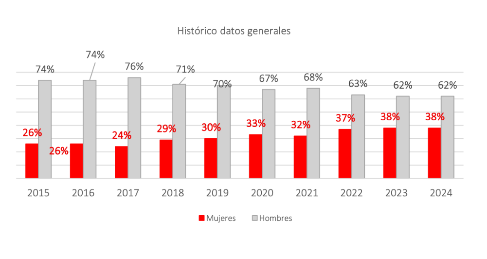 Un dato inédito del décimo informe: en nueve años (2015 a 2024), la representatividad de mujeres en el sector del largometraje ha aumentado del 26% al 38%, es decir, una tasa anual de crecimiento del 4.2% —acelerándose al 4.7% en la última década. Cabe destacar que, aunque la representación femenina aún no supera ni el 40% del total, si la tendencia actual continúa, la equidad entre géneros mínima podría alcanzarse para el 2026.