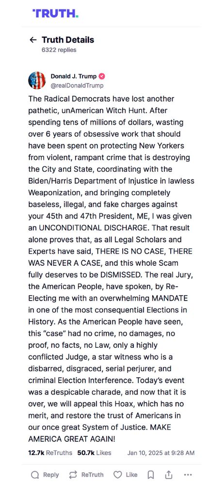 “Los demócratas radicales han perdido otra patética y antiestadounidense cacería de brujas”, publicó Trump en su red social, Truth Social, “recibí una LIBERTAD INCONDICIONAL. Ese resultado por sí solo demuestra que, como han dicho todos los académicos y expertos legales, NO HAY CASO, NUNCA HUBO UN CASO, y toda esta estafa merece ser DESESTIMADA por completo”.