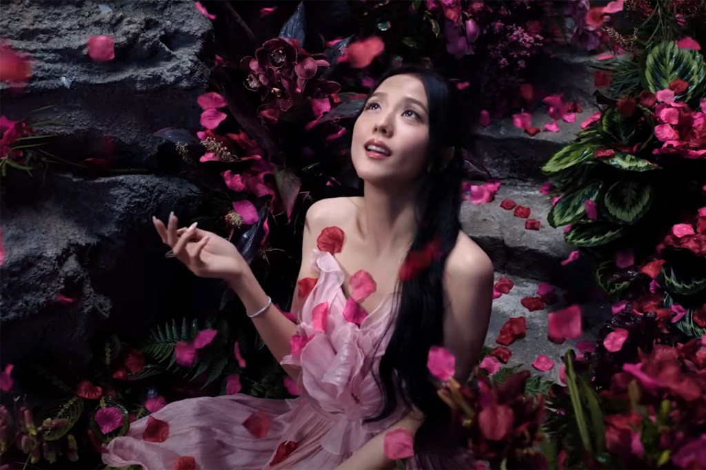 Y tu amor se siente como si solo hay luces verdes que conducen a casa ”, canta Jisoo mientras los pétalos de rosa llueven sobre ella.