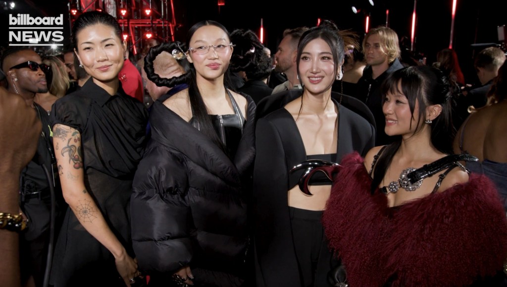 May Hong (actriz de voz para Mira), Audrey Nuna (Singing Voice for Mira), Ejae (Singing Voice for Rumi) y Rei Ami (Singing Voice for Zoey) de los 'Kpop Demon Hunters' 'Kpop' de Netflix 'Capturado con Kyle Denis de Billboard's Kyle en la alfombra roja de los 2025 MTV Video Music Awards.