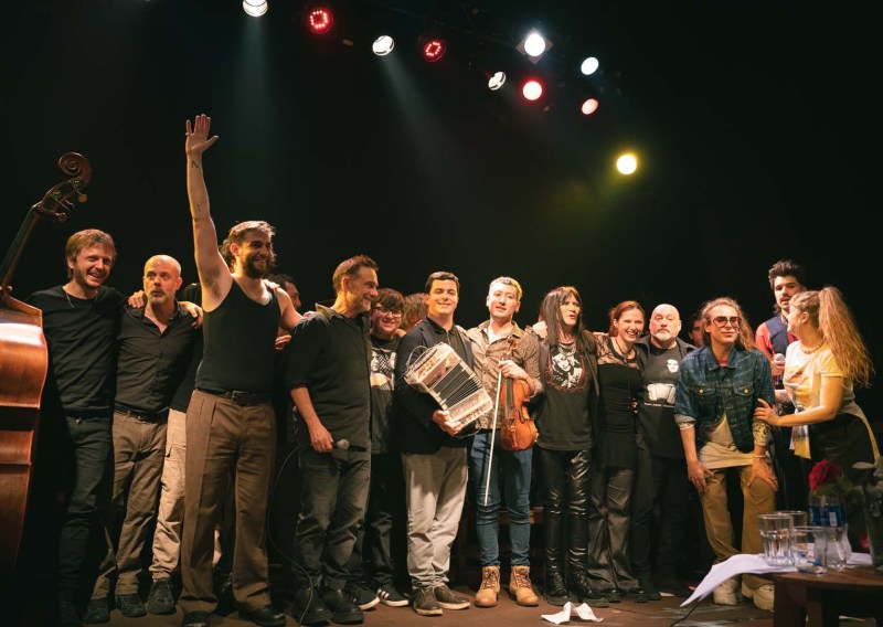 Con ese espíritu entonces, en una noche que muy probablemente agigantará su leyenda con el paso del tiempo, Florián cerró su ciclo de conciertos íntimos Actos de Gentileza, en donde el también guitarrista de Los Fabulosos Cadillacs se presentó en sociedad como cantor, acompañado por una formación (a)típica de contrabajo, violín y guitarra (más percusión y bombo según la ocasión y piano en las manos del mismo Florián), y con muchos amigos músicos invitados. Tangos clásicos (el concierto comenzó con “Cuesta abajo” y terminó, tres horas después, con “Cambalache”) y un repertorio propio y ajeno (ayer sonaron canciones de su último disco, De fábrica, así como también temas de Turf, de los Cadillacs y de Sandro, entre otros) con aires de tango y milonga. Una fiesta popular (con entrada gratuita) arriba y abajo del escenario (pasaron por las tablas más de veinte artistas), que inevitablemente por estos días linkea con la peña folclórica que Milo J y Mex Urtizberea montaron con FAlklore!.