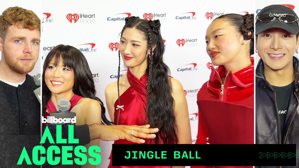 Amo a Jackson Wang. Pasamos el rato en el Jingle Ball de Los Ángeles y descubrimos si las chicas de HUNTR/X están haciendo música nueva y cuáles son los temas navideños favoritos de todos. Te llevamos allí en Billboard All Access, presentado por Capital One. Te lo preguntaré muy rápido, es iHeart Radio, es Jingle Ball, Navidad. ¿Cuál es tu canción navideña favorita? ¿Qué juegan los tres primeros?