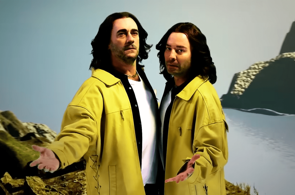 Luego tuvo lugar un flashback, en el que tanto Hamm como Fallon, el líder de rock Stapp, lucían sus largos mechones marrones y su chaqueta amarilla que llevaba en el vídeo musical de 1999 para el éxito de Creed, “With Arms Wide Open”. Los dos se turnan para cantar la letra en medio de un vasto paisaje verde, tocar el coro triunfante (y abrazarse profundamente en el proceso) cantando: “Con los brazos abiertos bajo la luz del sol/ Bienvenido a este lugar, te lo mostraré todo. .”