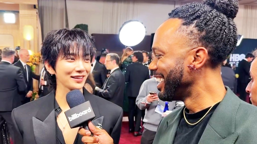 Joshua de SEVENTEEN se encontró con Tetris Kelly de Billboard en la alfombra roja de los Globos de Oro 2026.