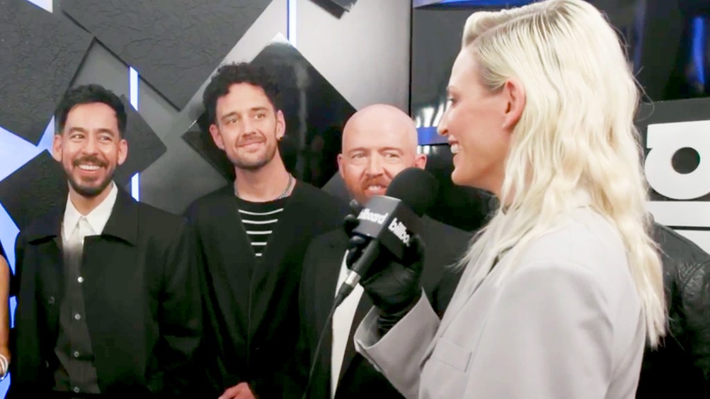 Linkin Park se encontró con Tetris Kelly y Leila Cobo de Billboard en la alfombra roja de los GRAMMY 2026.