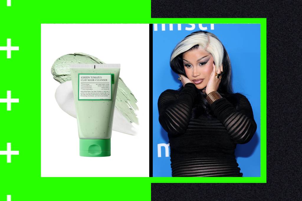 la máscara, venta al por menor por $ 15,29es un limpiador de arcilla 2 en 1 en tono verde pastel formulado con un 49% de extracto de tomate verde, lo que explica el tinte verde. Se dice que el limpiador se dirige a los poros obstruidos y al mismo tiempo ofrece un control excesivo del sebo (el sebo es una sustancia cerosa que producen las glándulas sebáceas del cuerpo) y un efecto de exfoliación suave.