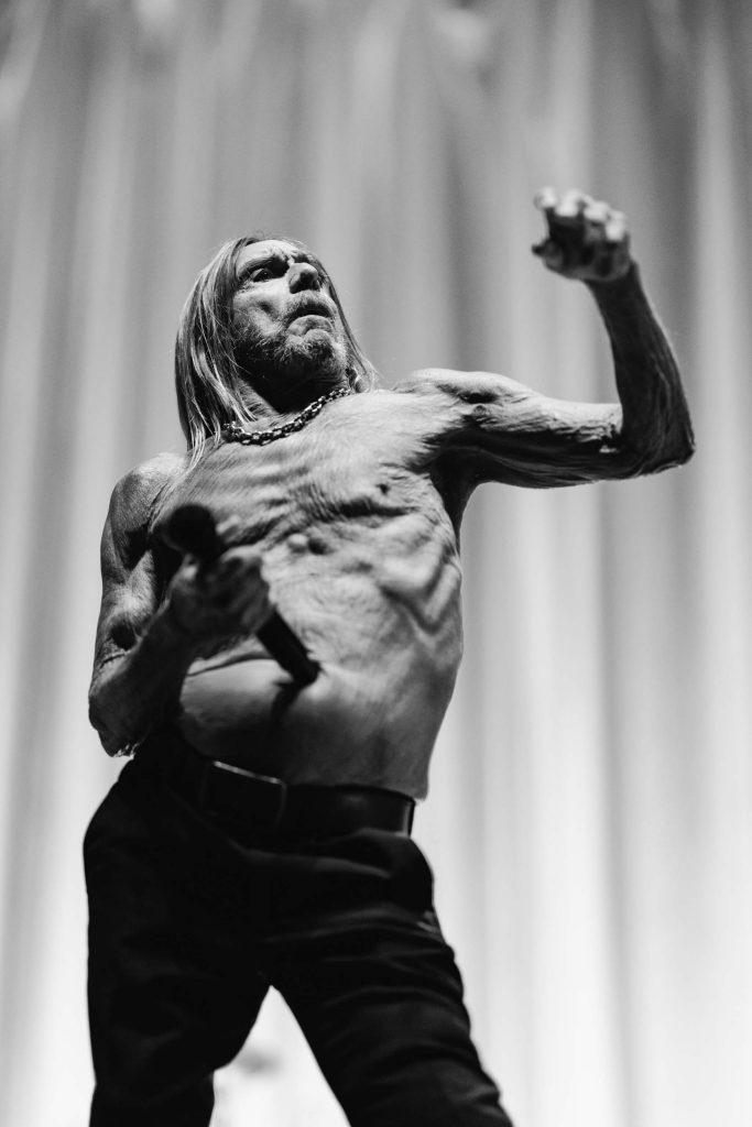 En épocas en que la música se consume como “experiencia”, James Newell Osterberg, nacido y criado en Michigan, ofrece su vida y obra de manera descarnada y conmovedora en escena. Y nada de esta fascinación tiene que ver con la edad que acredita su documento. Hemos visto ya a Paul McCartney emocionar con sus 80 años. También a Mick Jagger con la misma edad mover sus caderas y aplaudir de punta a punta del escenario. Lo escuchamos a Bob Dylan balbucear sus poemas sonoros. En todos estos casos, únicos por cierto en lo suyo, la nostalgia y el peso de los años juegan su papel. Pero lo de Iggy Pop aquí y ahora es definitivamente algo distinto.