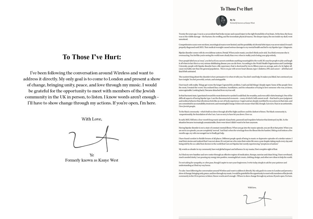 En enero, West publicó un anuncio en The Wall Street Journal en el que expresó arrepentimiento por sus comentarios antisemitas y los atribuyó a un trastorno bipolar tipo I no tratado, mismo que retomó y actualizó en referencia a la situación con Wireless, en un intento por revertir el rumbo de la situación.