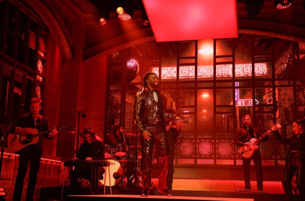 Más adelante en el programa, Shaboozey regresó para interpretar su éxito ineludible “A Bar Song (Tipsy)”. Vestido con una chaqueta marrón brillante y pantalones a juego, la estrella del country interpretó la canción en un ambiente similar a un bar con poca luz, rodeado por su banda de acompañamiento.