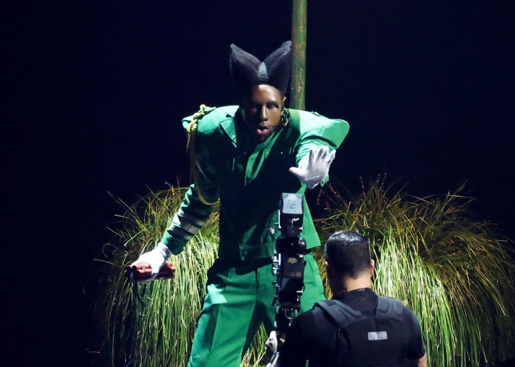Tyler apareció en su cromacopia uniforme, luciendo el traje militar verde trébol y prótesis faciales mientras interpretaban los cortes del álbum “Thought I Was Dead” y “Like Him”. Para la audiencia televisiva, hubo destellos de blanco y negro y vuelta al color mientras bailaba por el escenario frente a un cartel que decía “Lote 4 Oferta”.